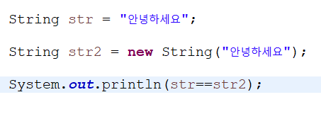 | String str = "안녕하세요"; String str2 = new String("안녕하세요"); String str3 = "안녕하세요"; |