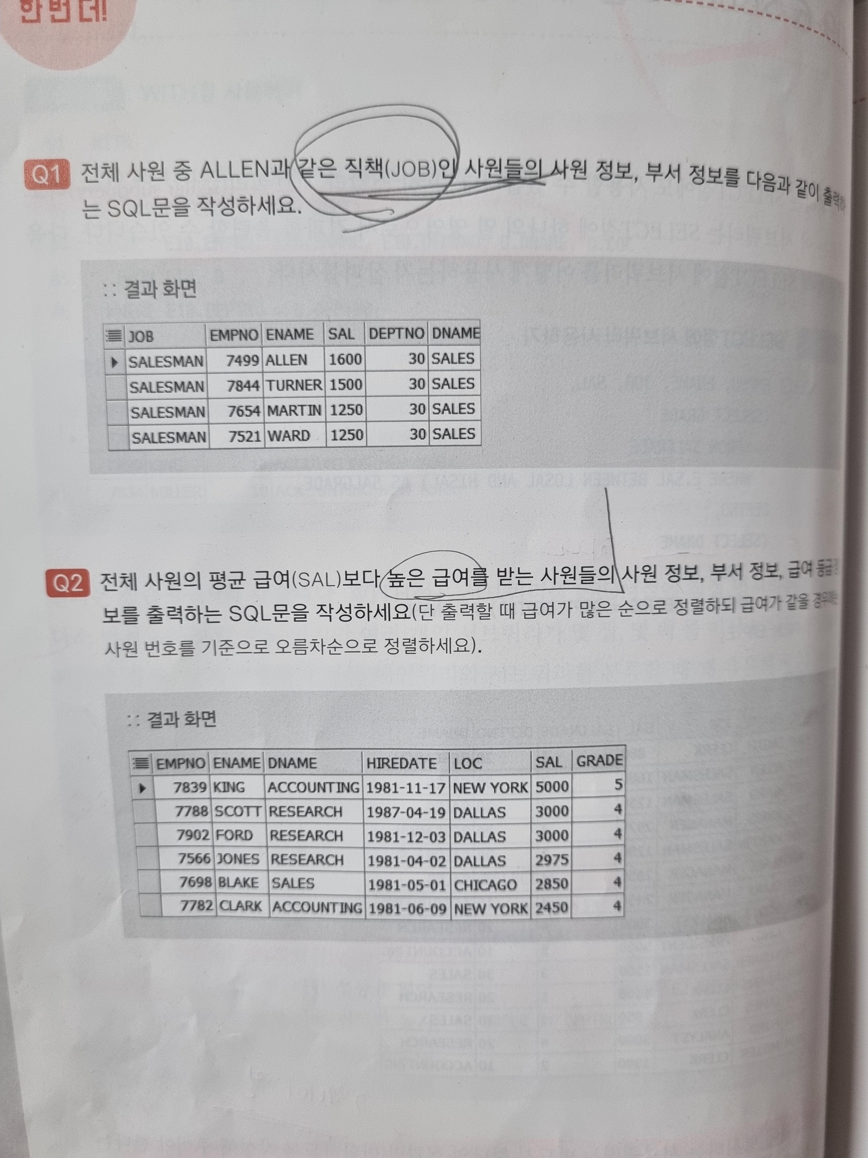 오라클 학습용 계정 scott 로그인: 9 SQL문 속 또 다른 SQL문, 서브쿼리 연습문제 page 262 늘 힘들었지만 오늘 특히나 힘들었다 ㅠㅠㅠ 1번문제부터 막혀서 미치는 줄... DEPT테이블하고 EMP 테이블의 열