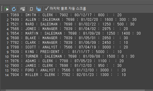 실행 절에 EMP테이블의 행을 하나씩 연관배열에 저장하고,