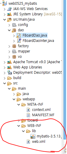 mapper로 사용 할 tboard.xml 파일을 작성해줘야한다. (스프링으로 넘어가면 할 필요 없음)