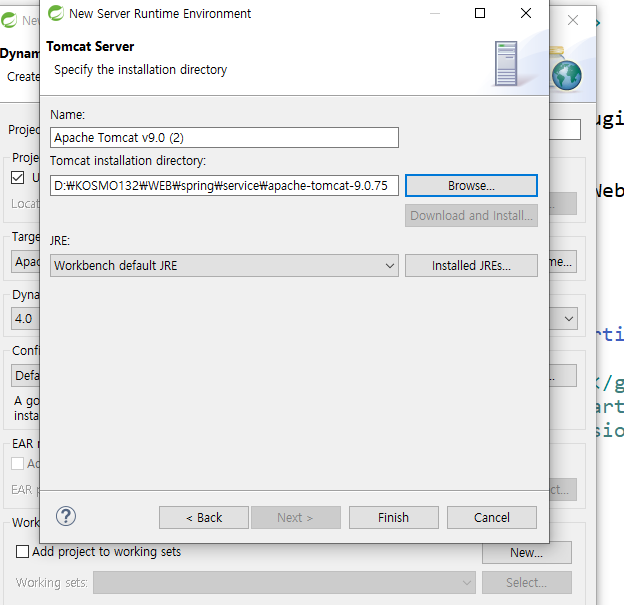 스프링프레임워크에서 : 다이나믹 프로젝트 생성 - > 타켓 런타임 설정 후에 다운받았던 톰캣 버전을 클릭