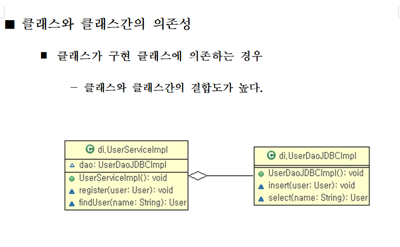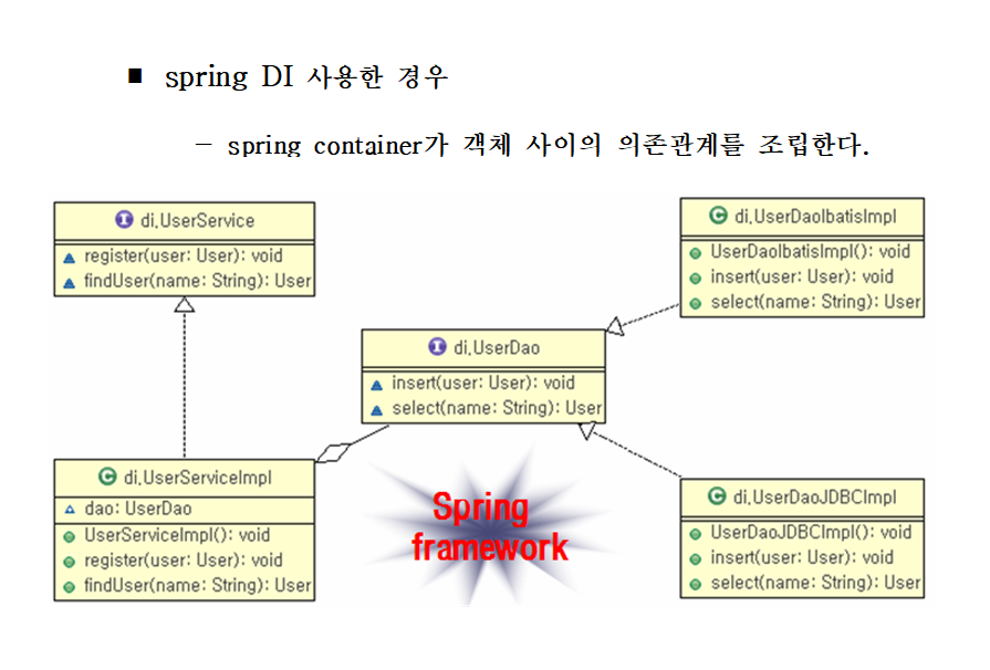 ■ 의존성 주입 : 객체들은 객체의 생성 시점에 spring container로부터 의존성을 부여 받게 된다. 즉, 의존하는 객체를 주입받게 된다.