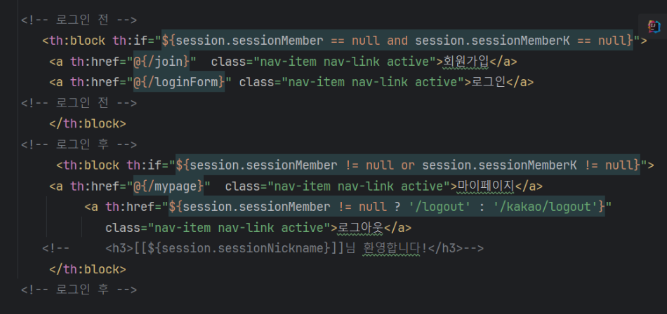 네비게이션 바에는 타임리프 if 구문을 사용해서 세션이 있을 경우 로그인/회원가입 ===> 마이페이지, 로그아웃으로