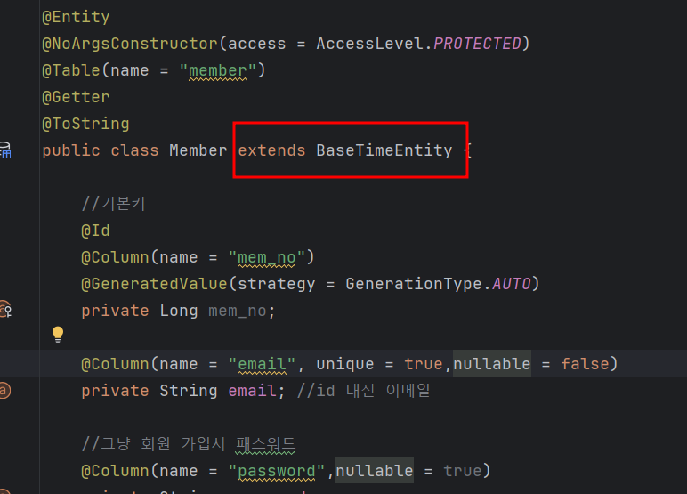 그리고 멤버엔티티가 이 엔티티를 상속 받으면 된다. 코드 더 적을 거 없음